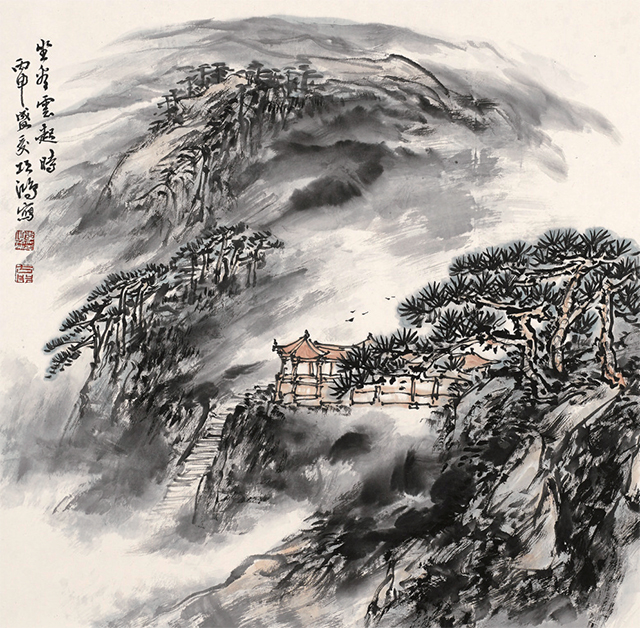 李项鸿作品之“淡”还体现在,其笔下的物象已经被画家进行了“自然的人化”,这种主观的变形有时达到了一定的抽象意味,进而强化了艺术家的主体心胸和主观心源,因此达到了再现与表现的统一、写生与写意的融合、物象与心象的共振,这无疑提升了审美形象的境界和意趣。《坐看云起时》中的松林、房舍是再现的、写实的、物象性的,但是对于云气、雾霭、山石的描绘则是表现的、写意的、心象性的,正是这种对比使作品具有了强烈的视觉张力与笔墨冲击力。