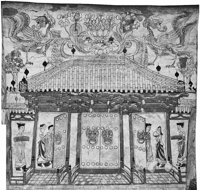 《平定西关村M1壁画墓》中,画面人物形象生动。北壁“内宅”垂帐床榻的左侧是一位身穿襦衫长裙、头绾高髻的女人,右侧站着一位身穿圆领长袍的髡发男子。东壁“杂剧”四人化装演出,一人在旁伴奏,诙谐有趣。西壁“进奉”描绘了一个头戴软脚幞头、身穿圆领长袍的男子指引三名小厮,两个抬着酒缸,一个手捧酒具。