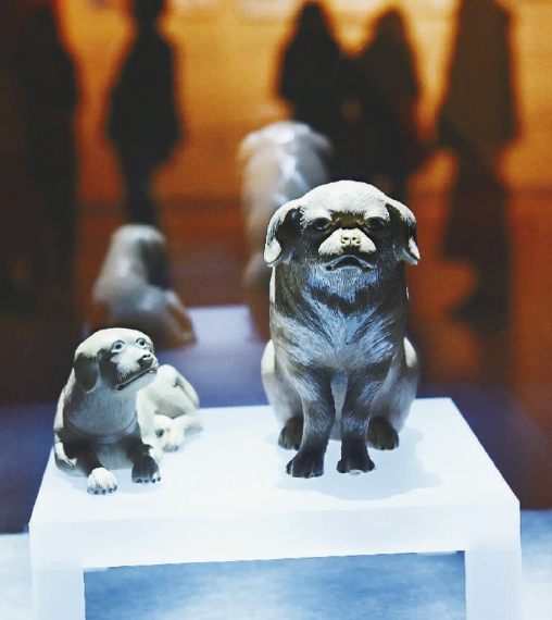 南京博物院为迎接农历狗年近日举办“幸运狗——南京博物院藏犬文物特展” ,展出历代以狗为题材的各类文物近百件(套) ,介绍传统狗生肖文化与艺术。图为清代陶塑狗在展厅展出。