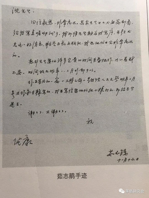 (来源于:《尘封的记忆——茅盾友朋手札》上海图书馆中国文化名人手稿馆编 文汇出版社2004年)