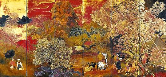 至20世纪30年代后期,阮嘉智、陈文谨、黎国禄等漆画家在越南美术界声誉鹊起,越南现代漆画史上具有奠基意义的作品接连问世。例如,越南美术馆收藏着阮嘉智创作于1939年的漆画屏风《花苑》。“这套屏风由八扇木胎构成,一面为风景,绘有芭蕉树丛等各种花草树木;另一面为人物,刻画了一群嬉戏于花间的少女。阮嘉智的重要性在于,他使用了银白、橙黄、天蓝、青绿等色彩,丰富了原来只有红、黑、金的漆色。另外,他也在蛋壳镶嵌技术上做了大量尝试,而且效果斐然。”