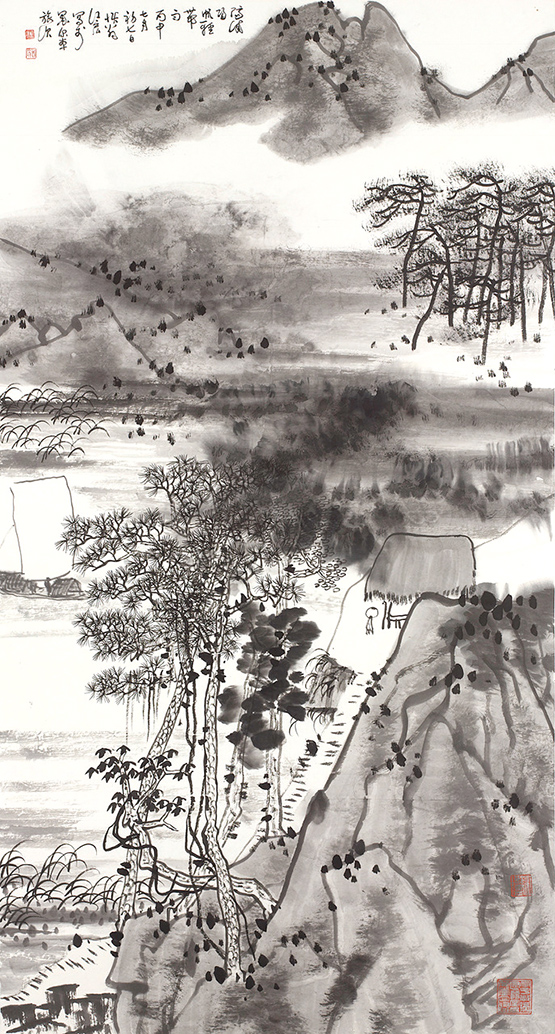 但他依然有着海派的优越和优雅,从容典雅,长松流瀑、远山近水、奇峰行云,都是以名士之风叙述描绘,娓娓道来,曲径通幽。他拓宽了海派的疆域,丰富了海派的内涵,把他江宏的性情在纸上渲染,用他精到的笔墨,写山水大风景、作人生大文章,把他艺术的审美和生命的体验表现得淋漓酣畅,爽了自己,也打动了别人。