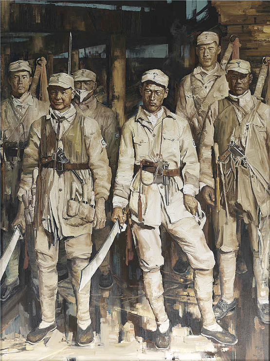 从《英国侵占香港》到《香港人民欢庆新中国成立》,再从《香港回归祖国,特区政府成立》到《不忘初心,坚持“一国两制”,香港的未来一定更美好》,香港回归祖国20年展中这些用中国画呈现的一幅幅历史瞬间,既再现了历史事件与人物对于香港近现代历史的深刻影响,也探索了中国人物画还原宏大历史场景所具有的独特艺术魅力,众多人物形象塑造与恢弘气象营造成为这些画作书写历史的艺术基调。在历史题材创作上,庆祝建军90周年全国美展中的《红军北上》《金戈铁马》《我的父辈》和《八路军大刀队》等,让人们看到了当代美术家对于人民革命战争的真切描绘、对于浴血奋战的英雄形象的完美塑造。这些创作还让人们看到了美术家追求历史真实的严谨创作态度与通过精湛的艺术语言重构历史的想象与创造,这种历史书写在当下更加鲜明地凸显出英雄主义的精神底蕴。