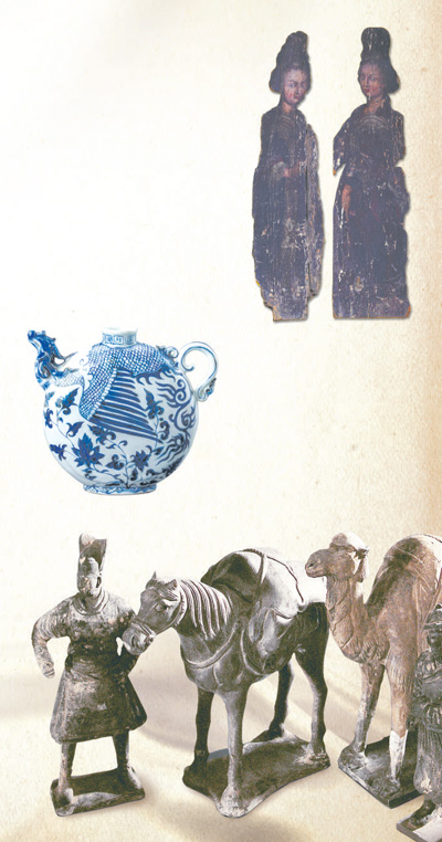 上图:新会木美人,明代。两个穿着中式服饰的西洋美人。 广东新会博物馆供图 中图:景德镇窑青花凤首扁壶,元代。所绘图案为一只凤凰昂首奋飞,在意大利服饰和绘画中也有大量中式凤凰图案。 首都博物馆供图 下图:陶俑,元代。丝绸之路上的一支商旅队伍。 内蒙古博物院供图