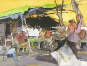 老挝湄公河边人家(水彩画) 周刚
