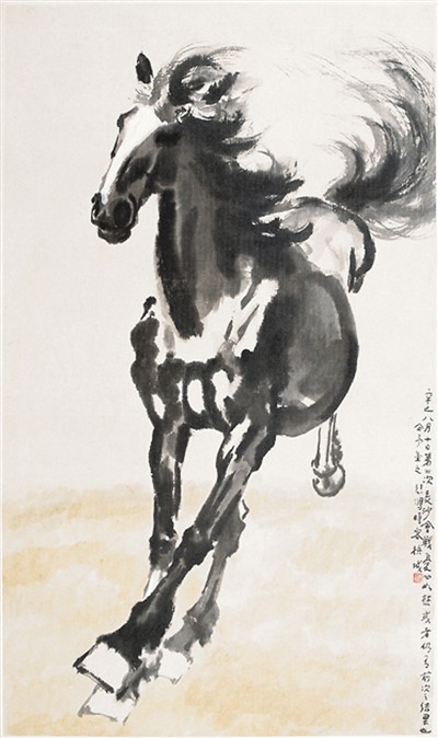 1941年,徐悲鸿赴马来西亚及新加坡举办画展,将卖画所得款项全部寄回祖国支持抗战。是年8月,中日第二次长沙会战开始。徐悲鸿十分关注国内战况,创作《奔马》。这是一匹由远及近、腾空奔驰而来的骏马。观者仿佛看到了奔马的速度,听到了马蹄蹬踏之声。他在画上题跋:“辛巳(1941年)八月十日第二次长沙会战,忧心如焚,或者仍有前次之结果也。企予望之。”