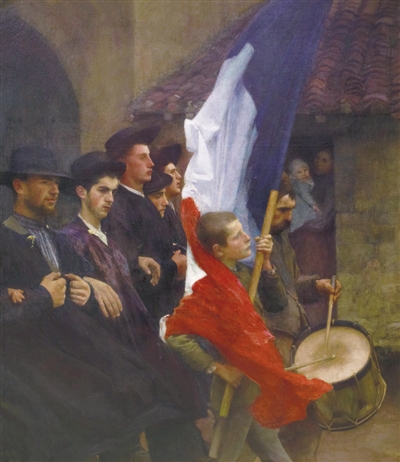 学院举办的沙龙展,也为18、19世纪法国艺术的繁荣做出很大贡献。1737年起,学院每年在卢浮宫的“方形沙龙”大厅举办“皇家绘画与雕塑学院沙龙展”,简称“沙龙展”。沙龙体制为艺术家提供了新的欣赏者和赞助者,使艺术界更活跃、多元,也形成新的艺术取向,影响着艺术的发展。展览中观众将欣赏到在沙龙中获得声誉的重要作品,包括安格尔的《朱庇特与忒提斯》、欧仁·德拉克洛瓦的《弗朗索瓦·拉伯雷像》、卡米耶·柯罗的《意大利风光》,还有帕斯卡·达仰—布弗莱的《应征入伍者》(见图)和其他一些在全世界享有盛誉的艺术作品。这些作品得以保存,得益于国家通过征订、购买沙龙展作品给予艺术家们的鼓励。购买和征订的作品收藏于法国国家造型艺术中心。