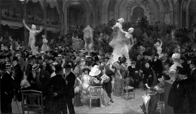 画家朱尔·亚历山大·格伦的《法兰西艺术家沙龙的一个周五》(1911)就展现了沙龙的盛况。作品呈现出一派熙熙攘攘的景象:大厅里、楼梯上、楼廊间,挤满形形色色的人群。画中矗立的几尊乳白色人物雕塑,巧妙缓解了黑压压的人物可能带来的沉闷感;它们中和着整个作品的色彩,也增强了画面的纵深感。画面中央,一位年轻时尚的白衣女性转身望向她的同伴,她们的对话在这人声鼎沸的地方仿佛显得格外突出,宛如乐队中的一曲小提琴二重奏。这幅作品不仅有美学价值,也有史料价值。画上的一百多位人物均有原型,其中有当时的学院派画家,甚至还出现了总统。