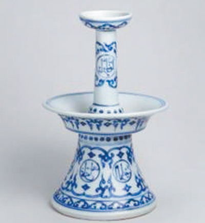 这是一件明正德年间的青花烛台。烛台很复杂,由四部分组成,最上端为蜡烛插口,外壁绘如意云头纹;其下为烛台细长支柱,中部绘圆形开光,开光内书写阿拉伯文,上下分别绘勾莲花枝纹及菱形纹。再下为承托圆盘,也绘如意云头纹;最下端为喇叭形台座,也绘圆形开光,开光内书写阿拉伯文,开光上下分别绘勾莲花枝纹及菱形纹。烛台上的阿拉伯文与传统纹饰,表现出阿拉伯文化与中华传统文化的交融。