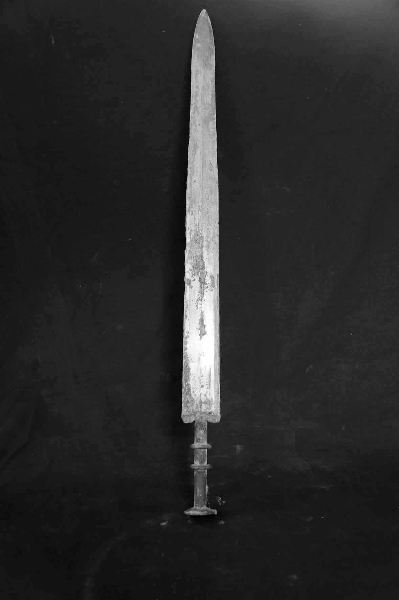 令人惊奇的是,在秦代墓葬中出土了保存完整的铜剑一柄。该剑通长60厘米,剑首为圆形,茎部呈圆箍状,剑身是中部起脊的八面体,近锋端有明显的束腰,保存较好。根据青铜长剑的造型特点判断,其铸造年代可能要早于战国晚期。据介绍,这种造型的剑最早出现于吴越地区,是具有很强杀伤力的传统“周式”长剑。