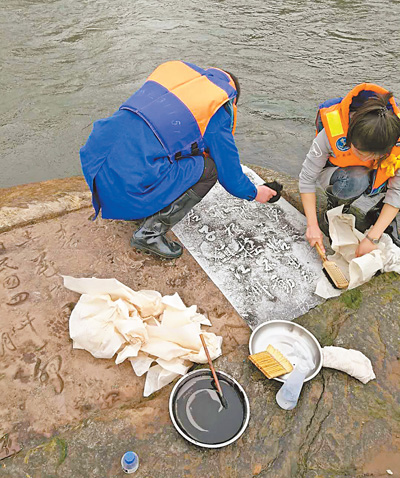 刘兴亮随即请江津方面提前联系好了船工,并准备了纸、墨、白芨水、拓包等椎拓工具。3月1日,他得知下午水位开始下降,莲花石“出水”了,立即带领文保团队开赴现场,要抢在江水上涨前获得更多的资料。