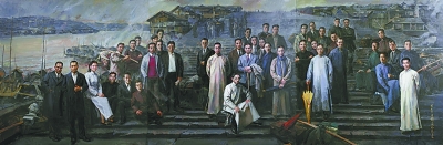 走进中国美术馆一层大厅,一幅长9米、宽3米的巨幅绘画《国美春秋——清明》把观众的思绪带回90年前的那段岁月。作品描绘的是1928年春国立艺术院建校伊始的图景,画面中有蔡元培、林风眠为首的建院一代人,也有最早的学生代表李可染、张眺、艾青等。他们在春雨霏霏的上午,登上奇石巍立的葛岭,俯瞰西湖,映身湖山之间,意气风发。