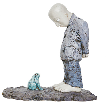 中国传统文化在人与物的关系上强调“合一” ,强调神与物游,体味自然之神妙。在该展的主题上,雕塑作品大多围绕人与自然生态的和谐、人与社会的和谐等展开, 《人与蛙》 《破风》《再生》 《彩虹》 《异域》 《倒影》 《中国风景》 《树》《开合》 《自由之外》等皆是如此。由王少军创作的《人与蛙》以人与蛙相互对立、互相凝视构成一组对比图,作品中人的眼神好奇、迷茫,蛙的眼神坚定、无畏,在二者的互相“审视”中,仿佛说出了人与动物的相处焦虑,也警告着凤凰彩票应有的对自然的尊重,而将其放置于沙滩前的草地上,似乎也在寓意着回归自然;武定宇创作的《溪山·闻声》以不锈钢为固体线条制作成一幅立体镂空的“溪山图” ,厚重的框架好似一幅相框,而蜿蜒的线条绘出了山与溪的形状,四周的树木丛林透过空出的部分进入画面,仿佛该作品与周围的树林合为一体,立刻有了生机。无论是作品本身对人与自然关系的哲思,还是现实中这些作品与周围环境的互动,都是将“合一”的价值用雕塑呈现出来。