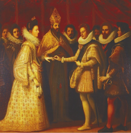这是一幅描绘意大利婚礼的传统绘画,是美第奇家族与贡扎伽家族的首次联姻。新郎与四名男宾立于右侧,新娘和她的母亲以及女宾们站在左侧。据记载1584年文琴佐·贡扎伽率大量随从来佛罗伦萨举行婚礼,教皇格里高利十二世派主教德拉·科尔格纳主持婚礼仪式。