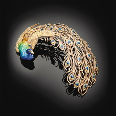 阿勒萨尼收藏展中的孔雀图案羽饰,包含黄金、铂金、钻石、珐琅