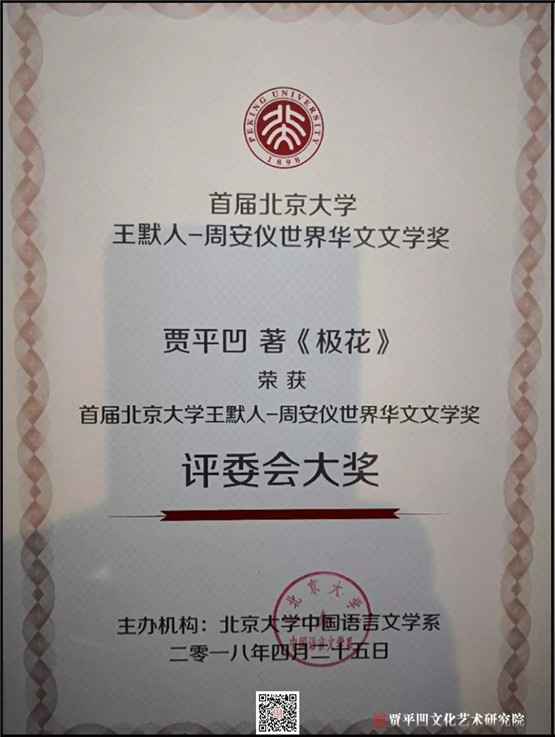 贾平凹长篇小说《极花》荣获首届“北京大学王默人-周安仪世界华文文学奖”评委会大奖