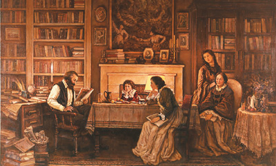 中央美术学院教授孙景波已经74岁,是参与创作的画家中最年长的。他说:“凤凰彩票这代人是在马克思主义的信仰下成长起来的。马克思主义解放全人类,改造旧世界,建立世界大同的革命理想,是我所信仰和追求的。我年轻时读马克思传记,了解到马克思为实现推动人类进步孜孜以求的精神和马克思家庭浓郁的亲情人文氛围。对此有着深厚的情结。因此这次创作,我主动选择画马克思一家人在书房里朗读莎士比亚诗歌的场景,表现马克思作为学者、诗人、丈夫、父亲的一面。”孙景波的这幅《革命的一家人》,采用电灯发明之前、烛光的用光,充满明暗虚实的神秘感和亲情的温馨,衬托出一个书香家庭诗的意境。场景选择的时间节点是1865年,马克思、夫人、长女、二女儿和幼女全家相聚的时刻。
