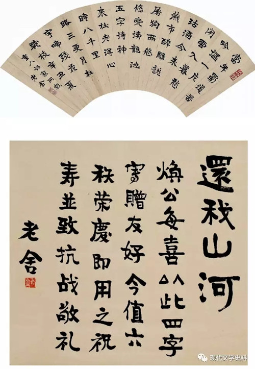 其三,雅致。书法基本是高雅文化,对文人雅士而言,其书写行为本身就透露着雅致的人文气质,是他们骨子里的东西。作为“人民艺术家”的老舍,崇尚雅俗共赏、由俗向雅。其书法手稿自然而然透露着他的这种雅致的文人气质。 老舍文学创作手稿作为存世的复合文本,堪称高雅文化的瑰宝,原本是其“文学生产”过程中的最初成品,只是提供给编辑审看的文稿,并不直接进入传播渠道。而他那些存世的书法对联、扇面,有意识创作的横幅、条幅书作,还有因雅兴因情感而为的诗稿、书信,基本都是沉稳的楷书形式,雅意盎然。其中,他常用自作诗词的书法作品馈赠友人,尤其是他和身为画家的夫人胡絜青合作的书画作品,更为友人所珍视。这类适用于文人雅士交往的书画作品,既体现了对传统高雅文化的继承,也显现了现代文人的情趣和志向。就老舍书法而言,确实功底颇深,多体杂糅,古拙质朴,别具风貌,其笔法明显带有北碑意趣,线条坚韧凝重,结构内敛紧凑, 用笔张弛有度,且时或兼容汉隶及金农漆书笔意,墨象高雅,气质不俗,能够给人留下深切而又鲜明的印象。