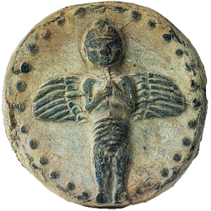2014年,新疆维吾尔自治区博物馆举办的《丝路遗珍汇天山——西北五省文物精品展》,就陈列了一件具有异域特色的瓦当。这件瓦当直径13厘米,由青海省民和回族土族自治县川口水泥厂出土。瓦当上绘一羽人,圆脸,大鼻子、大眼睛,上身赤裸,梳圆形发髻。羽人双手合十于胸前,背上有双翼,周围以联珠纹作环状围绕。