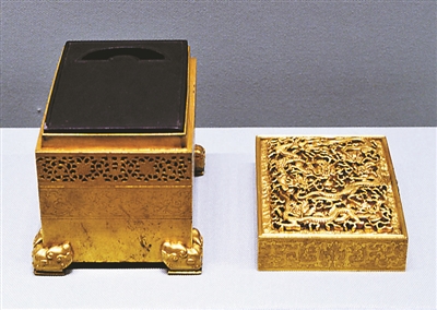 据了解,清宫用砚一般是由内务府造办处承办制作,还有少量来自地方官员年例进贡,或由地方织造按内廷发样承做。在砚的制作工艺上,清代宫廷御用砚不仅精于造型设计,而且还注重装饰工艺和题材,在造型、纹饰、雕刻等方面多有创新。一般是由内廷如意馆画师画样,或遵照皇帝的旨意照砚样成作。特别是康熙、雍正、乾隆三朝皇帝均参与过砚的设计,而且各有所长。如雍正皇帝曾参与暖砚的设计,并对暖砚进行两方面创新:一是命作铜炉式暖砚,并称“砚即可热,炉也可烧香”;二是新创用水屉温砚的形式。此两种形式的暖砚均有实物传世,在此次展览中也有展示。