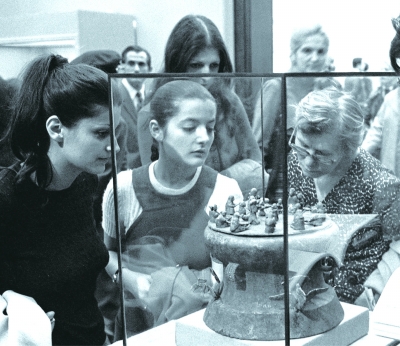 1973年,“中华人民共和国出土文物”展览赴法国展览,法国观众正在欣赏我国云南晋宁出土的西汉纺织铜贮贝器