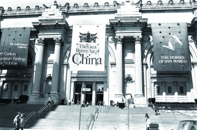 1980年4月12日至7月9日,“伟大的中国青铜时代”展览赴美国纽约大都会艺术博物馆展出,博物馆门口悬挂起巨幅展览海报。