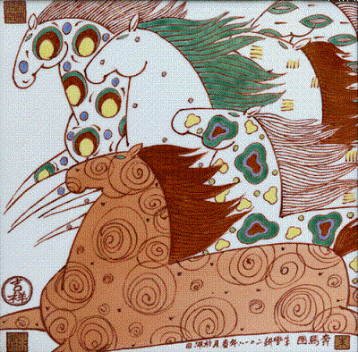 《奔马图》之二40x40红绿彩瓷板画2018