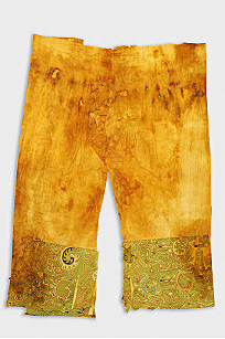 从出土的实物来看,当时精绝人的裤装可分为筒裤和灯笼裤两种形制。1959年,尼雅古墓出土一件东汉时期的男夹裤,用粗棉布作面,宽腰大裆,裤腿口与山普拉古墓出土的灯笼裤相比,显得比较宽大。裤腿用草绿色细绢镶缀,以绿地动物花草叶纹为主绣,草绿色细绢为底,配以绛紫、黄、宝蓝、白等各色丝线,运用锁绣法绣出卷草叶、豆英、金钟华等纹样,纹饰的枝蔓循环繁复,表现出汉代高超的织造工艺,同时显示出汉代织锦“锦绣并用”的特征。