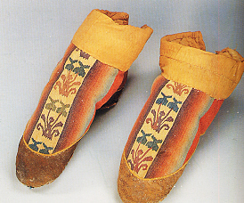 靴子是西域居民的传统衣式。1995年,尼雅1号墓地3号墓出土的一双红底晕裥缂花靴的样式十分独特。靴子长29厘米,高16.5厘米,用皮、绢、毡等多种材料缝制,靴面中央的白底上织并蒂花卉图案,起到了锦上添花的装饰效果。靴子构思巧妙,形制新颖独特,是新疆古代鞋靴中的精品。