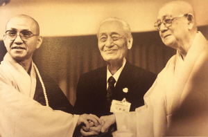 1995年5月,首届中朝日佛教友好交流会议在北京举办。图为中国代表团团长赵朴初居士(中)与韩国代表团团长宋月珠长老(右)、日本代表团名誉团长中村康隆长老(左)握手。