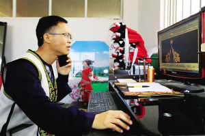 苏涛设计民族服饰图案时用手机与同行交流。