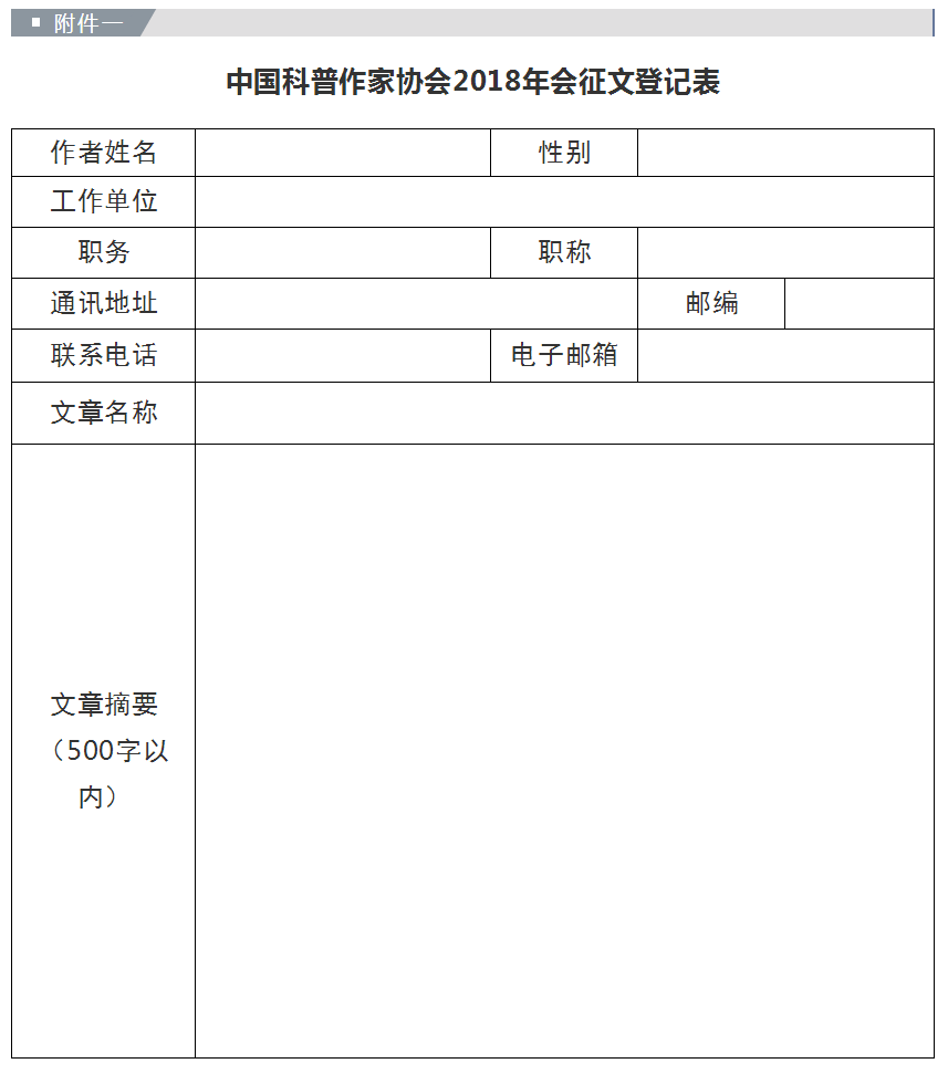 附件1:中国科普作家协会2018年会征文登记表