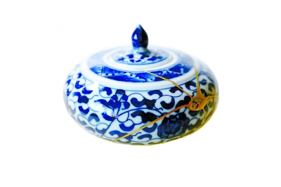 虽然中国掌握大漆修复技艺的历史很早,在明代黄成所著的《髹饰录》就有漆修古器的记载,但介绍的技法如“云缀”等语焉不详,据王世襄先生考证也无法肯定。日本将中国陶瓷烧造技术、漆器制作技术引入后,逐步进行了本土化改良。据传在日本桃山时期就有了漆修陶瓷的技法,用大漆黏合补缺并施以金粉或金箔装饰的手法,被称为“金缮”,是非常受尊重的一种工艺技法。
