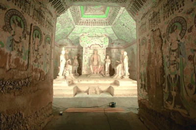 莫高窟第55窟是敦煌石窟代表洞窟之一。它建于宋建隆三年(公元962年)前后,由当时归义军节度使曹元忠出资修建。洞窟现存倚坐弥勒佛像三身,菩萨像三身,弟子像一身,另塑力士像两身,是莫高窟保存最好的一组宋代彩塑,造型衣饰有唐代彩塑的余韵。第55窟面积为585.6平方米,面临自然损害的风险。