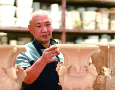 龙泉青瓷传承人蒋同磊正在制作青瓷素坯