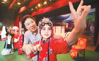 日前,在河北青县木门店镇扣庄村“哈哈腔”传承示范基地,传承人刘宗发(右二)正为排练中的小演员指点表演动作。