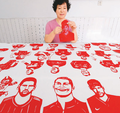 日前,河北省邯郸市民间剪纸艺人冯石萍利用两周时间,创作出以梅西、C罗、内马尔等球星为原型的剪纸作品,迎接世界杯的到来。