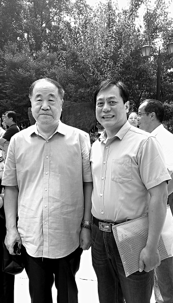 在鲁迅文学院举行的开学典礼上,作者与著名作家莫言(左)合影
