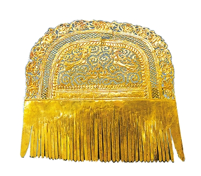推测为安史之乱时期的伎乐飞天金栉代表了当时的技艺水平。金栉是一种头饰,用薄金片镂空錾(zàn)刻而成。这枚金栉呈马蹄形,下部呈梳齿状,栉面上部满饰花纹,中心主纹以卷云式蔓草作地,上饰两个对称的奏乐飞天,飞天下方饰一朵如意云纹。周边饰多重纹带,分别为单相莲瓣纹带、双线夹莲珠纹带、镂空鱼鳞纹带、镂空缠枝梅花间蝴蝶纹带等。