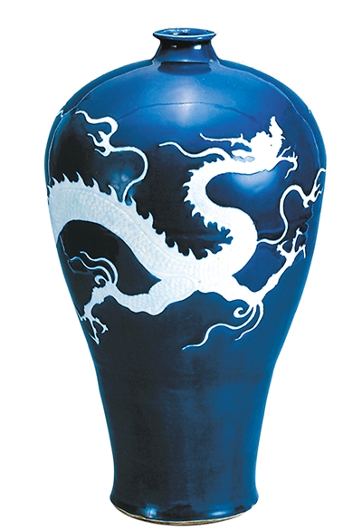 元代的蓝釉瓷器传世十分稀少,目前全世界仅存有12件,而白龙纹饰的梅瓶只有3件,另外两件分别收藏在巴黎集美博物馆和北京颐和园。藏于巴黎的那一件,白龙头部烧制的时候有黑点,不够完美,北京的那一件,瓶身有一道明显的裂痕。而扬州博物馆这一件器型最大,也是最完美的一件。