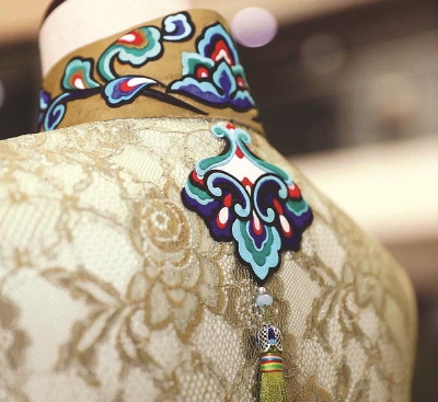 研修班结业成果,海派旗袍设计师苗海燕与唐卡技艺传承人申支足共同完成的堆绣旗袍。(均上海公共艺术协同创新中心供图)