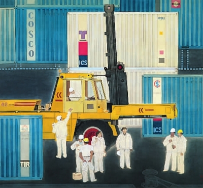 斗转星移,沧海桑田,改革开放赋予了时代新的活力,不仅影响着城市的面貌、行业的发展,也渗透在每个人的日常生活中。从1978年小岗村的承包契约,到2017年的C919国产大飞机,从老式收音机、翻盖手机,到网络图标、共享单车……40个代表其所属年代的物象,在作品《四十年的温度》中以图谱的方式依次展开,让观者直观感受到改革开放40年间百姓生活所经历的点滴变化;《时代新象》将各个品牌的快递车集于一画,这些与当代人生活息息相关的画面不仅能有效引起观众的共鸣,还为艺术作品增添了几分接地气的质朴;《年轻建设者》《同心协力》《地下筑梦者》等作品从不同的方面热情讴歌了劳动者昂扬的精神风貌;《都市凡人》《小生活》《书香满城》则以敏锐而独特的视角,切入普通百姓的日常生活,呈现出充满温度的时代图景。