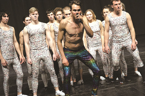 过多的论述性独白,让这部作品看起来更像是一篇探讨当今网络时代资本主义个体与群体关系的社会学论文。剧中,波列许以布莱希特关于个体与集体的思考为基点,辐射出了对个体与网络、个体与媒介关系的现代追问,引出了人们是否还愿意为爱而殉情、网络时代人的信用何在等话题,甚至还插入了马克思、福柯、让-吕克·南希等人的观点“以身说法”,以增加作品的理论性和说服力。波列许追求建立在深刻基础上的批判,但他的讲述过程深入浅出、表现手段日常而浅显,他善于将自己的论点分散在舞台演出的不同节点上,以流行元素、时尚媒介、视听冲击加以伪装,让观众轻而易举地进入他的舞台世界,这正是波列许戏剧创作的高明之处。比如,添加赶时髦乐队的音乐,以此表现当代人激情的缺失,没有人愿意再为爱情而赴汤蹈火了;播放迈克尔·杰克逊的演出视频,以此来讽刺标榜虚伪个性的人,其实就是消解自我的一味模仿;“资本主义合唱团”跳起了《大河之舞》,暗示着流行文化带来的千篇一律,实际上背后没有实在的东西;在摇滚歌手莫里西《人生是一个猪圈》的音乐中,舞台成为旋转的游乐场,合唱团的成员们在雨中肆意狂欢,毫无底线地放纵着自己,而此时的法茨独自拉着大篷车,逆时针地艰难前行,这段对“大胆妈妈”的戏仿,表达的既是一种逃离的行为,更是一种坚持个性的生存选择与态度,只是最终,他失败了。