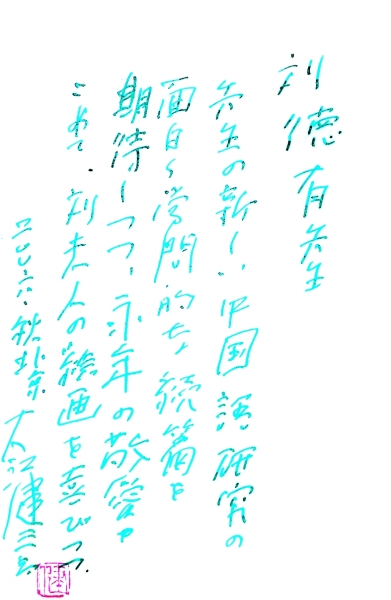 大江健三郎在赠给刘德有的《别了,我的书》(中文版)扉页上写的话
