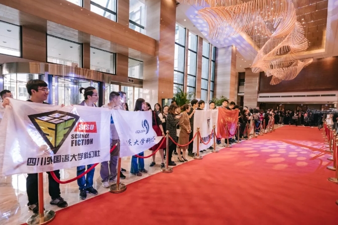 11月3日下午,颁奖典礼前,作为全球华语科幻星云奖一项重要传统的入场仪式——科幻红毯礼在重庆雾都宾馆大堂盛大举行。来自重庆大学、西南大学、重庆邮电大学、四川外国语大学、四川大学、成都理工大学、南京工业大学等多地高校科幻协会代表及重庆南开中学的众多科幻迷们,早早地站在红地毯旁等候,欢呼迎接科幻明星们。