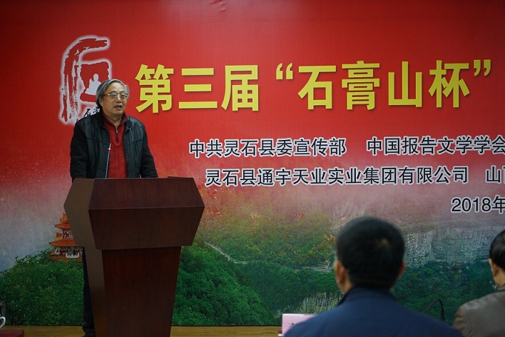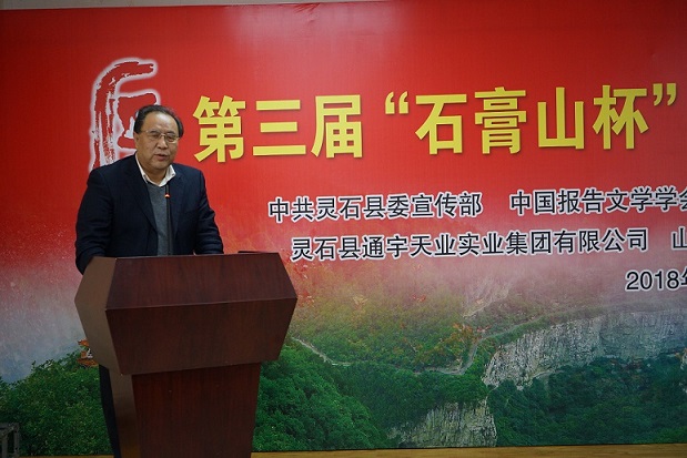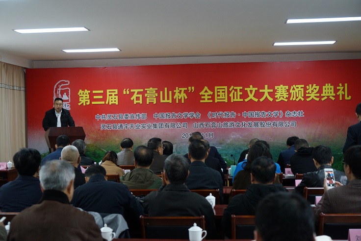 11月10日,由《时代报告·中国报告文学》杂志社和山西石膏山旅游文化发展股份有限公司共同举办的第三届“石膏山杯”全国征文大赛颁奖典礼在山西灵石石膏山举行。山西省作协党组书记、主席杜学文,中国报告文学学会常务副会长、《时代报告·中国报告文学》主编李炳银,编辑家、作家周明,中国报告文学学会副会长、山西省作协副主席赵瑜,山西灵石县委宣传部副部长曹正阳,山西通宇天业集团董事长张建新,《时代报告·中国报告文学》杂志副主编魏建军,以及灵石当地作家参加颁奖活动。