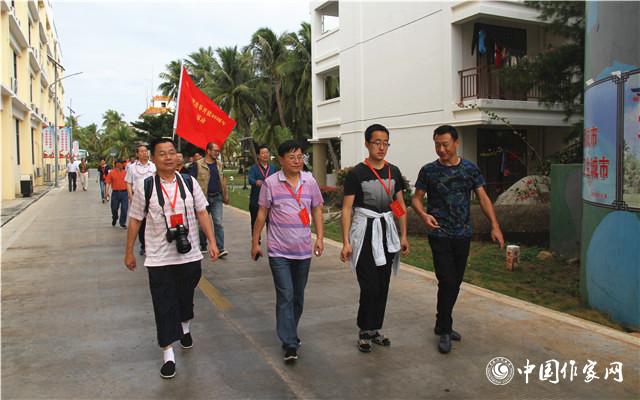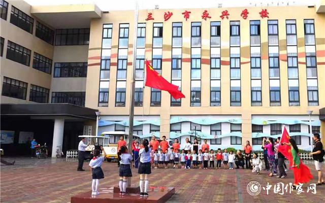 采访团第一站来到三沙市永兴学校,当时正是早上8点钟,学校的孩子们正在楼前的空地举行升旗仪式,采访团的团员们也加入了升旗的队伍,向着国旗行注目礼。随后,采访团成员参观了学校的教学场所和办学展览,观看了学生制作的各种手工作品。永兴学校是中国最南端的学校,于2015年投入使用,目前学校有27名学生,都是渔民和守岛军人的子弟,毕业于琼台师范学院的10名教师在此执教。作家们与老师和学生交谈中,感受到了永兴学校的不一样的情怀。作家王松告诉记者,“看到那个升旗手踮着脚尖小心翼翼地把国旗的绳子拴好……我不禁流泪了,到这里的每一刻,都能强烈地感觉到‘爱国’这两个字。”