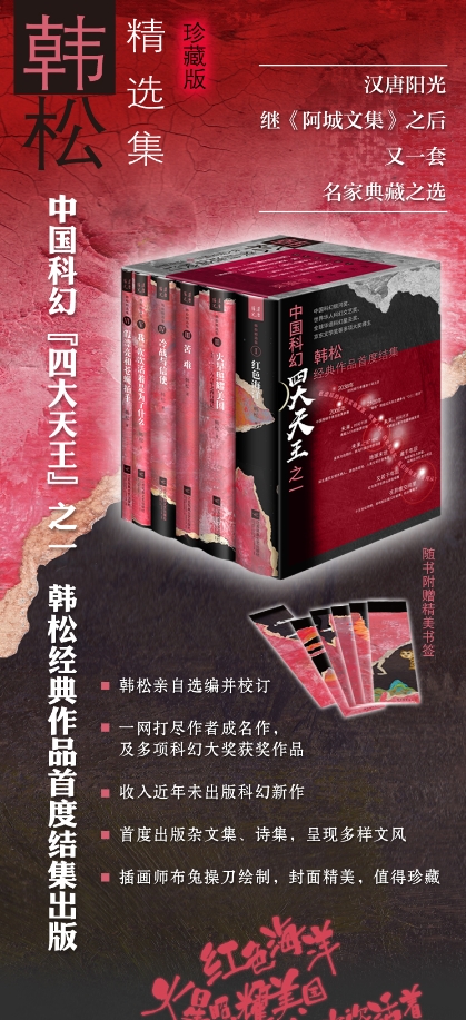《韩松精选集》是韩松首次将经典作品结集出版,由作者本人亲自选编,包括2部经典科幻长篇,2部中短篇小说集,1本杂文集,1本诗集,收录成名作、获奖作和未出版新作,集中展示了韩松的科幻创作成果。封面由知名插画师Butu绘制,大面积黑红色交织,先锋感十足。
