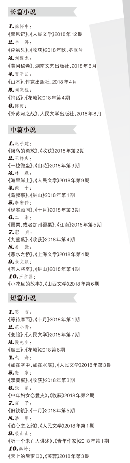 中国小说学会2018年度小说排行榜