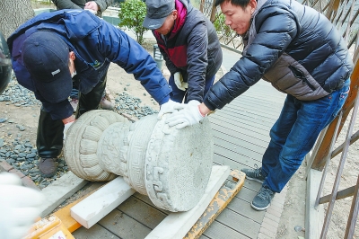 昨天,市总工会将机关院内发现的清代露陈墩等8件石刻文物捐赠给圆明园收藏。 本报记者 吴镝摄